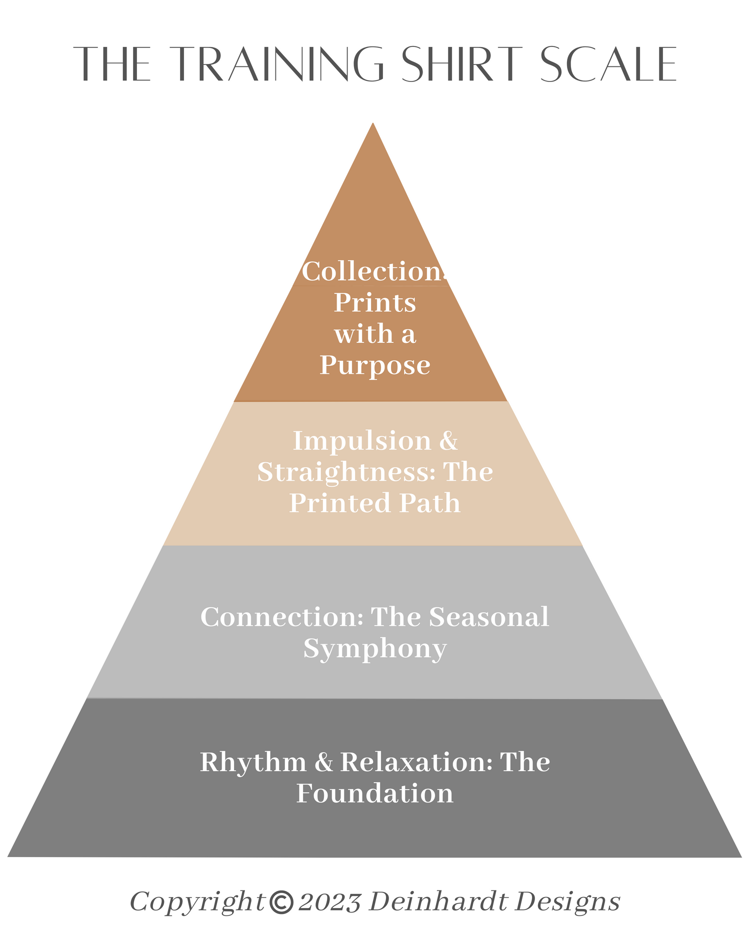 In crafting the "Training Shirt Scale," we've drawn inspiration from the esteemed principles of dressage, merging them seamlessly with our commitment to quality and purpose. Through this tiered system, we invite you to embark on a journey that mirrors the stages of equine training, showcasing your dedication to excellence and your passion for the equine world.