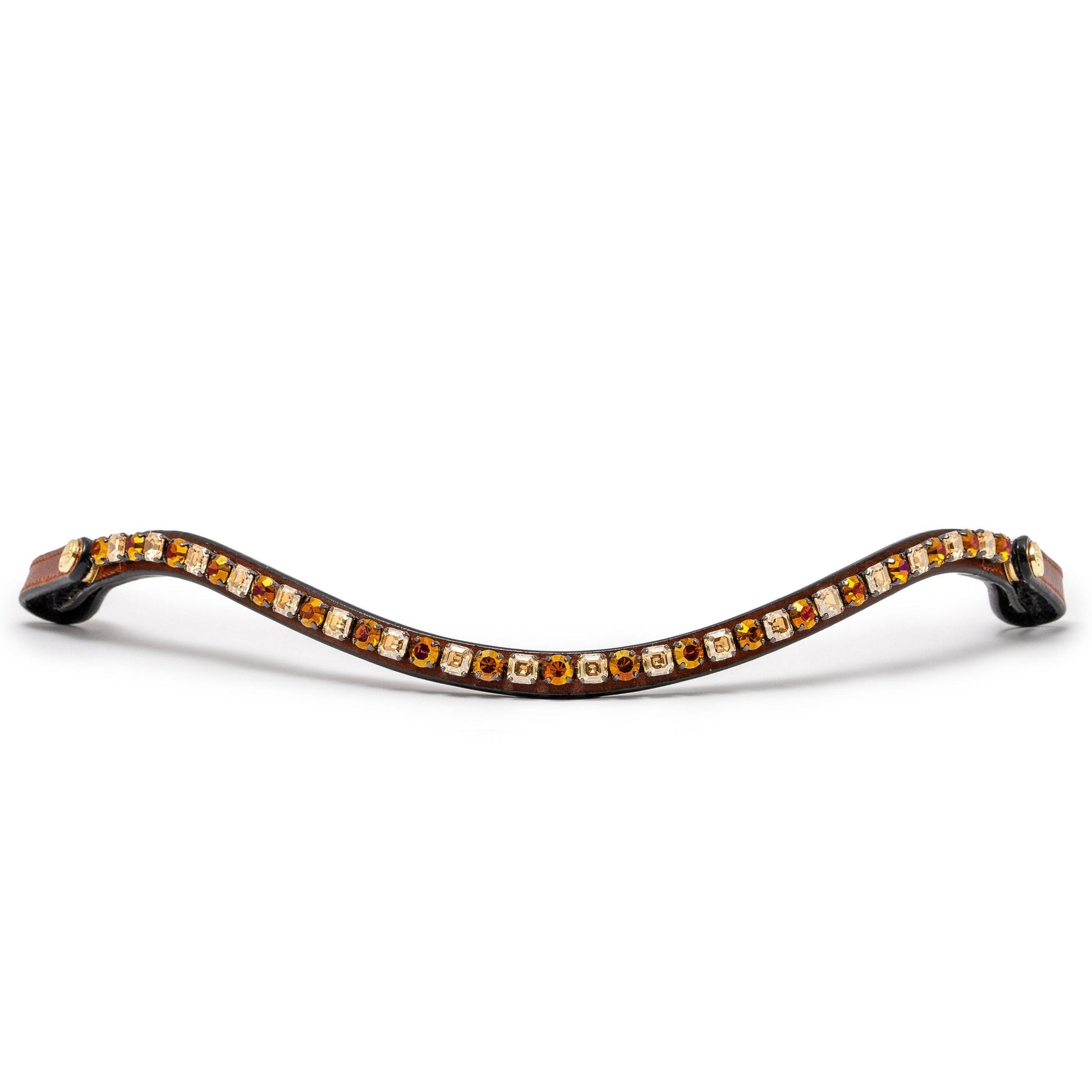 Featuring a stunning, rich cognac colored leather, with buttery soft tan leather padding, conical shaped noseband, removable flash, golden brass buckles, hook & stud bit hangers and a stunning slimline browband with Princess Cut and Chaton crystals that have been specially coated with a limited edition finish.